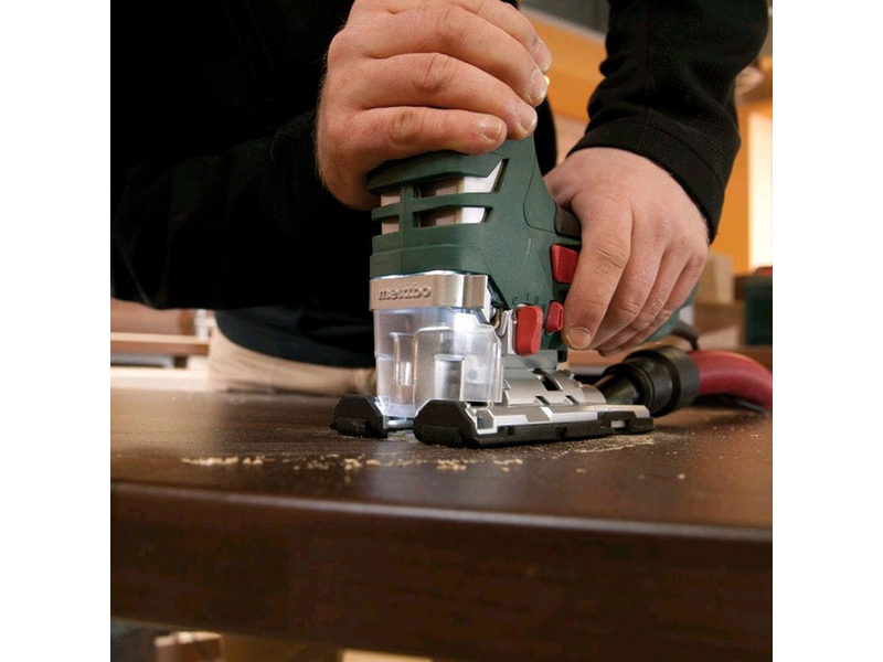 Fierăstrău pendular Metabo STE 140 Quick - este un ferăstrău electric puternic cu electronice VTC pentru tăierea rapidă a lemnului moale de până la 140 mm. Tăierea precisă a materialelor în conformitate cu proprietățile lor datorită alegerii numărului de lovituri, cursa pendulului și ghidajul scăzut al lamei de ferăstrău cu suportul cu arcuri Metabo Quick pentru înlocuirea lamei de ferăstrău fără scule, cu ejecție automată. Funcția de suflare asigură o vizibilitate clară a zonei de tăiere. Durată de viață lungă datorită angrenajului și designului motor optim, precum și unei carcase robuste din aluminiu turnat.