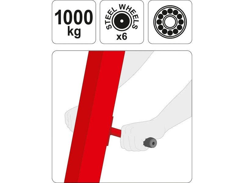 Manovrabilitate: Șase roți metalice rezistente și o mâner special permit deplasarea ușoară a macaralei.