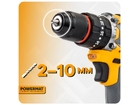 Самоблокирующийся патрон позволяет быстро устанавливать насадки диаметром от 2 до 10 мм . Это решение упрощает замену сверл и насадок без необходимости использования дополнительных инструментов.